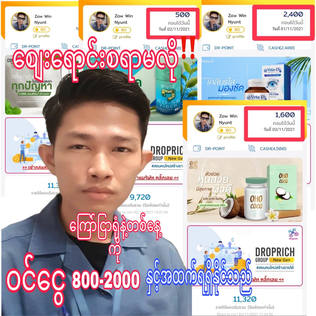 အရင်းနီးရင်းစရာမလိုပဲ( Droprich app ) ထဲက ပစ္စည်းတစ်ခု ၁၂၀၀ ဘတ်ဆိုရင် အမြတ်ငွေ ၈၀၀ ရတယ် နှစ်ခုဆို ၁၆၀၀ ရတယ် သုံးခုဆို ၂၄၀၀ ဘတ်ရတယ် ကျန်းမာရေးနဲ့ညီညွတ်ပြီး ပိုက်ဆံလဲရနေ့တိုင်းထုပ်လိုရတဲ့အလုပ်ပါ