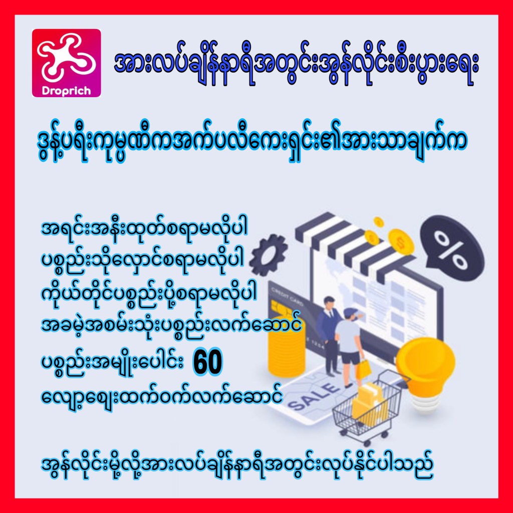 အလုပ်ကတော့ အွန်လိုင်းရောင်းဝယ်ရေး ID ဖြန့်ချီရေးစနစ်တစ်ခုပါ ဈေးရောင်းတာမဟုတ်ပါဘူး ကိုယ်တိုင်လဲပစ္စည်းမပို့ထိဘူး ( Droprich ) ဈေးဝယ် app ကိုအသုံးပြုဖို့ မိတ်ဆက်ပေးရုံပါပဲ မိတ်ဆွေက app ဒေါင်းလောစ်လုပ်ပြီးပစ္စည်းဝယ်အသုံးပြုခြင်း ( သို့မဟုတ် ) ရောင်းဝယ်ရေး ID CEO/BO ကောင့်ဖွင့်သွားရင်ဝင်ငွေက ကိုယ့်ရဲ့ ID အကောင့်ထဲဝင်လာတယ်